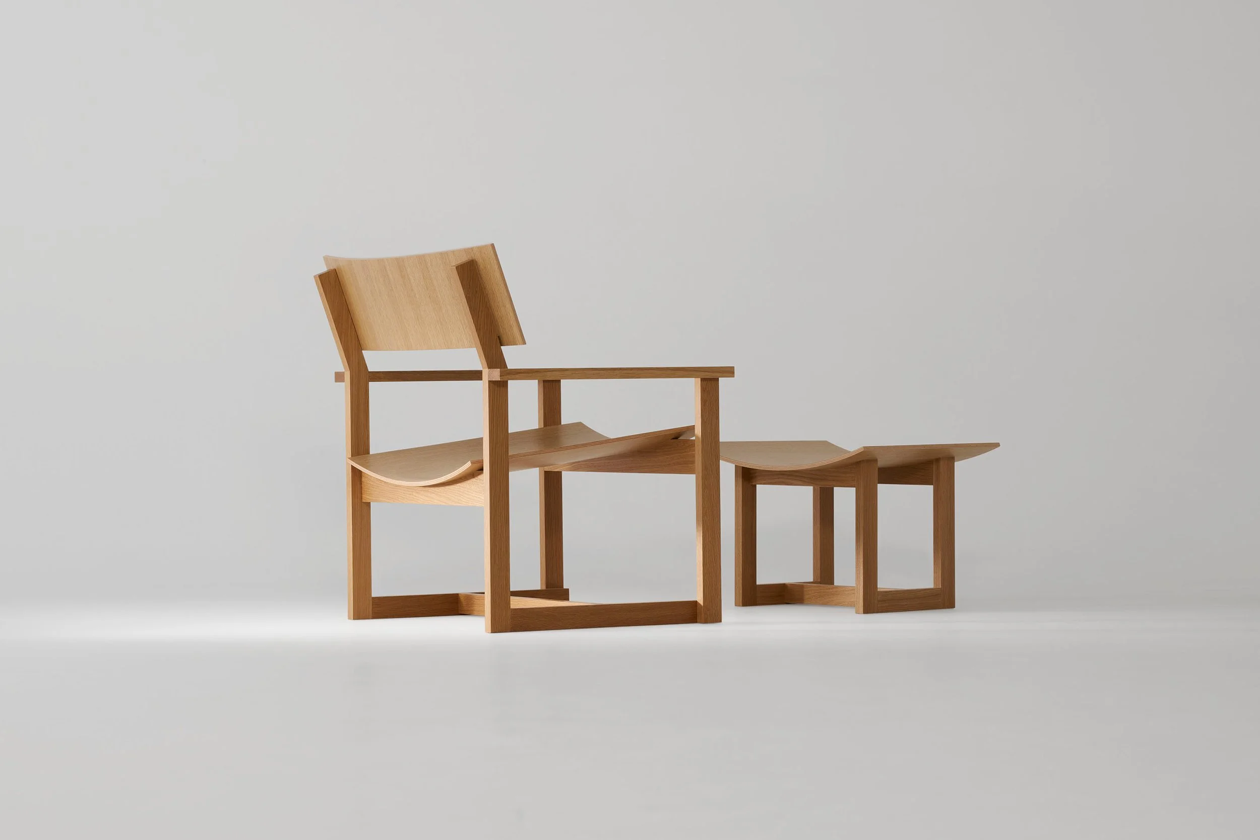 Michael Anastassiades blends comfort and a minimalist sensibility in the Makuri lounge chair and ottoman for Japanese brand Koyori. The invitingly curved plywood seat and backrest encourage repose, while refined joinery and an uncluttered design create a sense of lightness. The upholstered version incorporated natural, untreated leather in a thin cushion that works beautifully with the chair's oak frame.