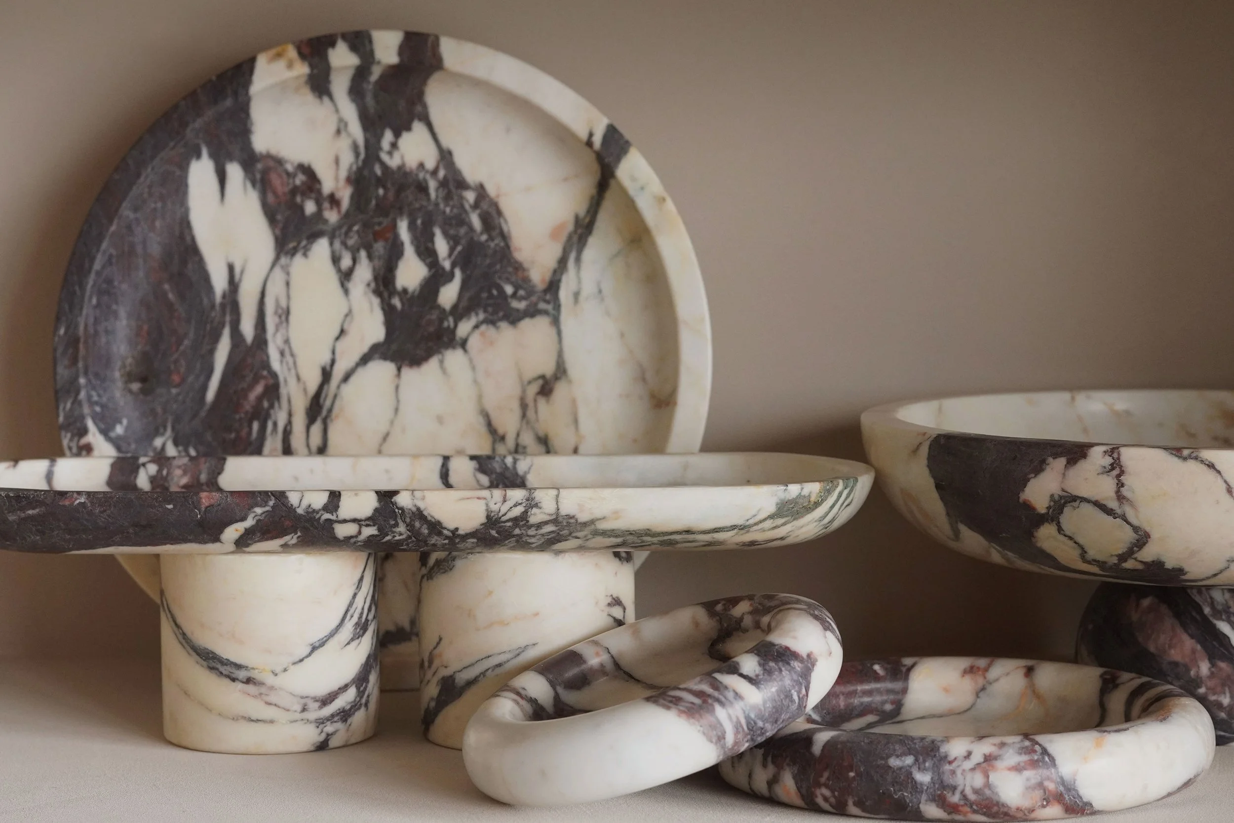 Hong Kong duo Lim + Lu has launched Viola, a collection of vessels crafted from leftover pieces of Calacatta Viola marble they found during their visits to quarries around Italy. The collection’s five different vessels each showcase the material’s natural beauty, with deep shades of burgundy and bold veining. Hand-sculpted by skilled artisans in Xiamen, the vessels are functional sculptures that can be displayed as objets or used as bowls or valet trays.