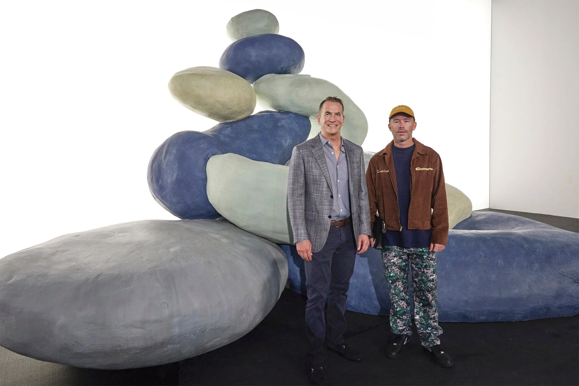 David Kohler and Daniel Arsham in front of Stone Flow at Design Miami/ 2021