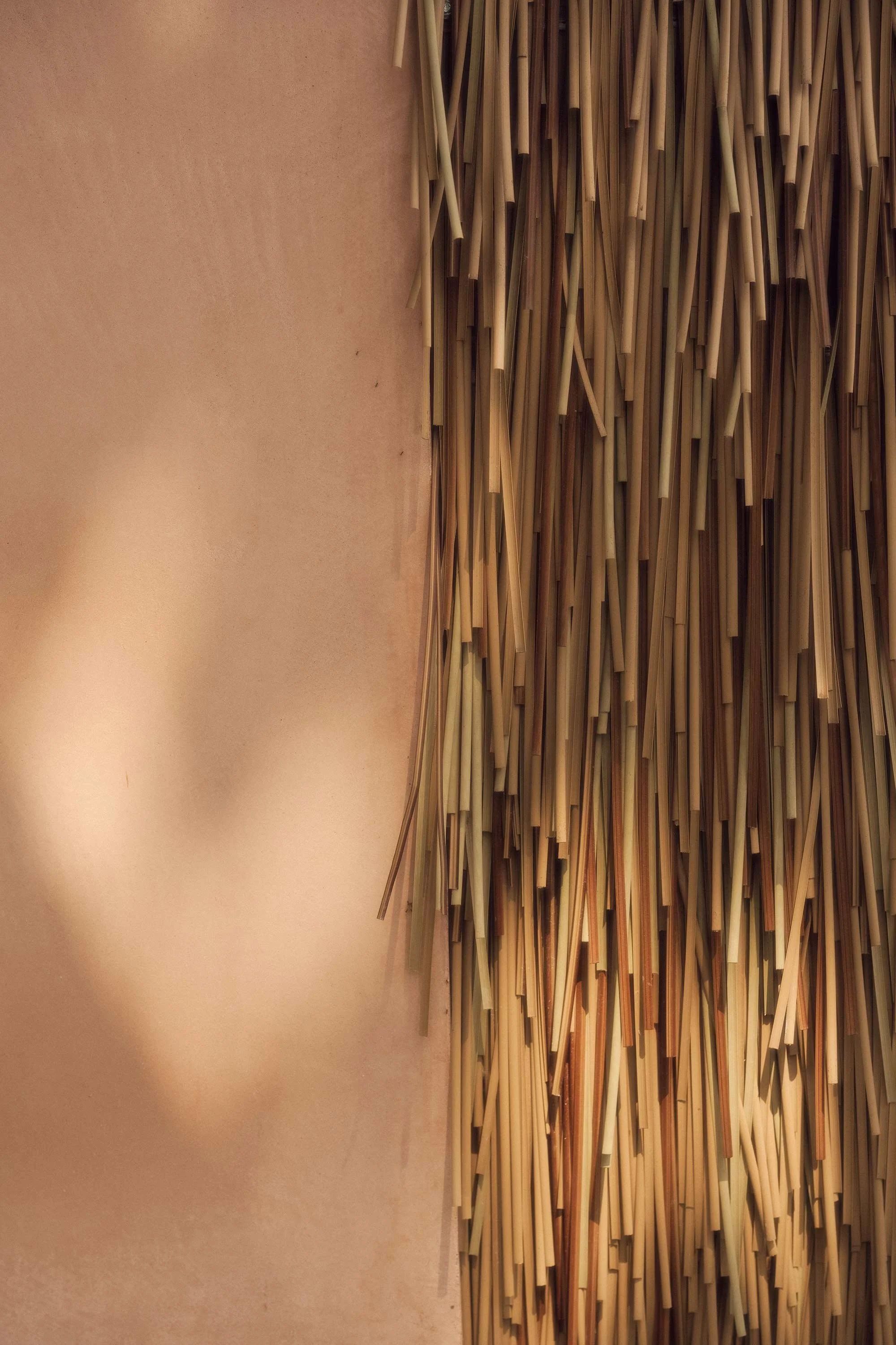 We opted for a palette that emphasises natural, tactile materials. The use of lime plaster, thatch and stainless steel allows for a play of textures and light, enhancing the aesthetics and creating a calming and immersive atmosphere. The earthy tones and soft finishes reflect the intention to craft a space that feels like a warm embrace. The materials were chosen not only for their visual appeal but also for their ability to engage the senses, making the experience of visiting Kinya not only visual but about touch, texture and comfort.